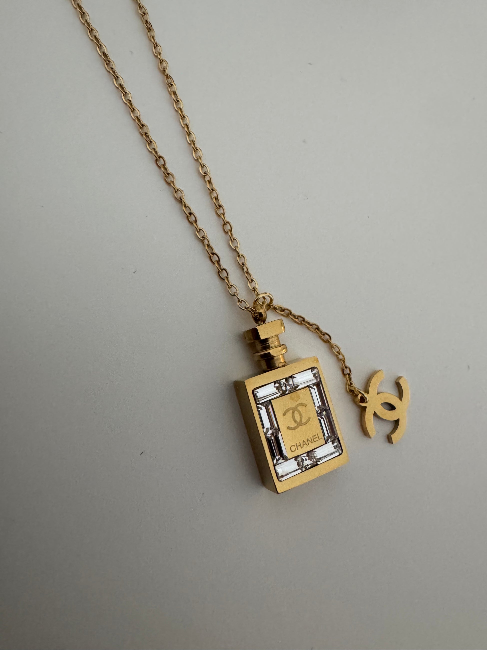Kette mit Parfüm Flacon 18k Edelstahl graviert mit CC Anhänger